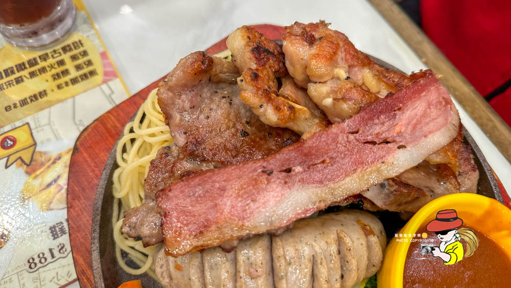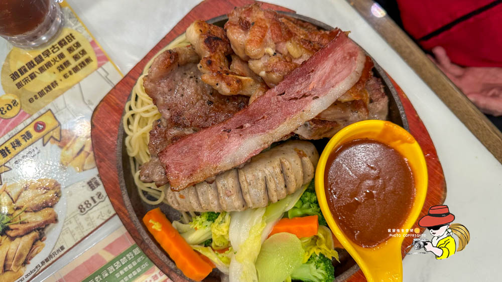 再嚟個美式雜扒配燒汁,每次看港劇就覺得一定很好吃!所以我點了!結果真的謝謝不聯絡欸~培根跟熱狗真的蠻鹹的!豬牛雞排就中規中矩,然後有一種沒有很新鮮的肉味,我真的不知道自己在吃啥!哈哈哈哈哈!