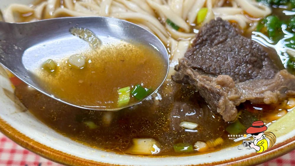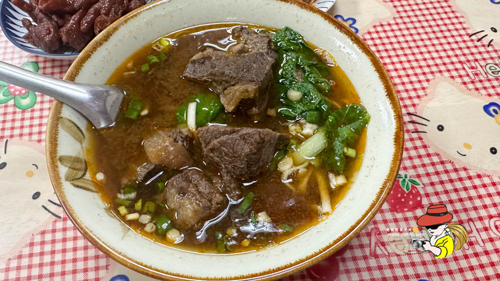 我點的是半筋半肉牛寶麵,我對牛肚真心還好,第一眼看過去,賣相是OK的,碗裡躺著牛腱肉、牛筋,份量給得也算阿莎力,我覺得還行!湯頭就就是很標準的牛肉麵湯頭,不死鹹,帶點微甜,是那種你不會特別驚艷,但會覺得嗯~這味道還可以的路線!