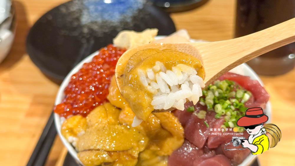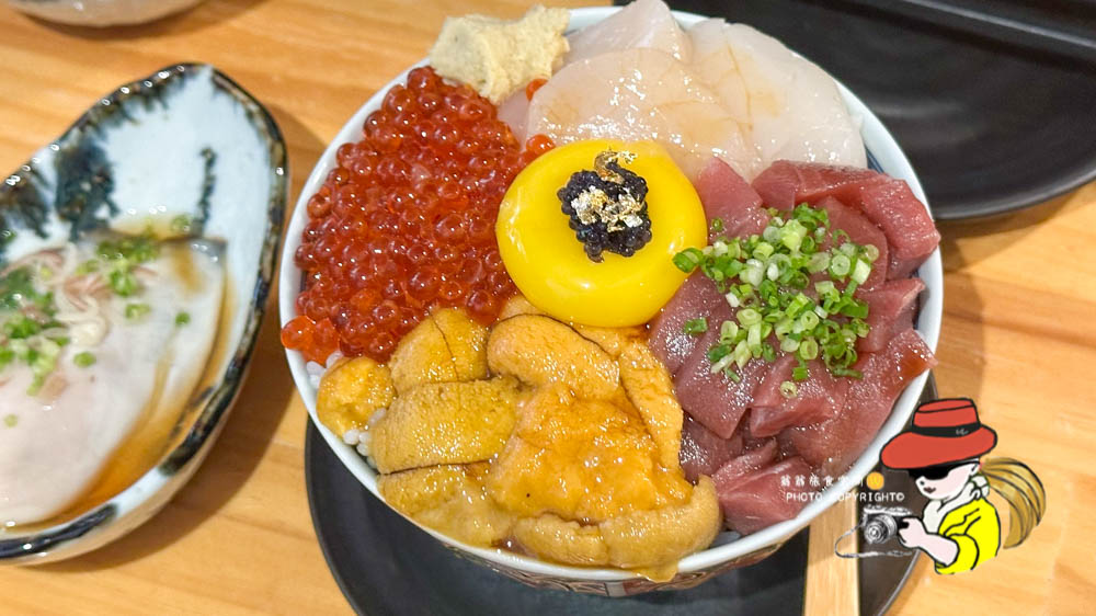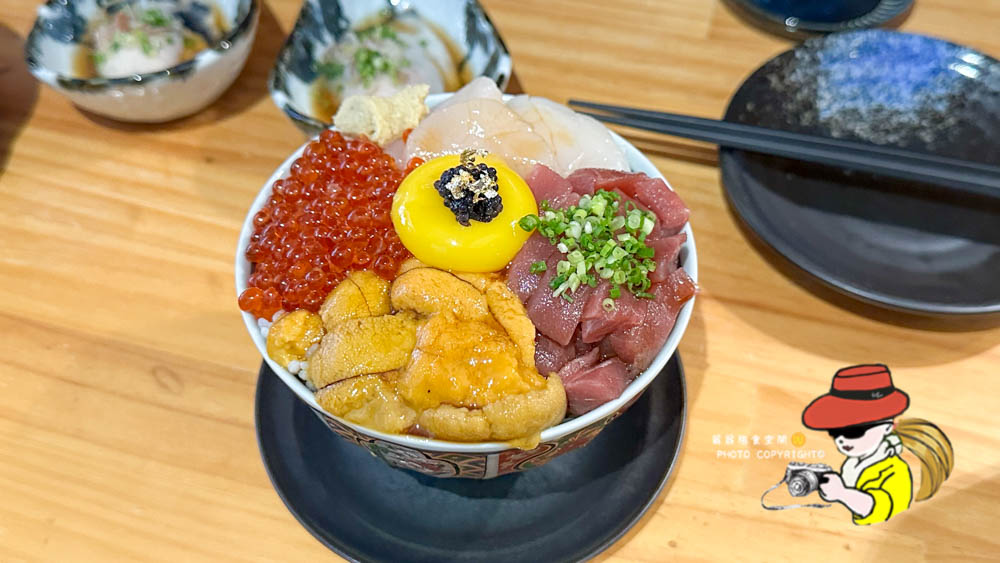 這碗月見四色丼飯一上桌,我的眼睛都亮了!四種海鮮排排站,中間還躺著一顆晶瑩剔透的生蛋黃,光看就讓人心花怒放!我跟你說,這四色分別是干貝、鮪魚、海膽、還有那個閃亮亮的鮭魚卵!每一樣都新鮮到爆炸,鮪魚的鮮甜,干貝Q彈的口感,帶著微微的甜味,尤其是海膽沒有超級可怕的馬糞味,超級鮮甜!真的神好吃!醋飯就中規中矩,但是我吃光了,絕對不是我單純餓!