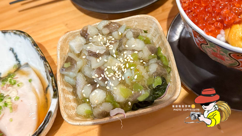 看看這滿滿的鮭魚肉和鮭魚卵,那橘紅色的光澤,媽的,光看就口水直流!鮭魚肉切得厚實,油花分佈均勻,吃起來超軟嫩,鮮甜感十足!重點是那個鮭魚卵,咬下去「啵滋啵滋」的卡滋聲,每一顆都爆出濃郁的海味,鹹香回甘,搭配醋飯一起入口!如果你是鮭魚控,這碗絕對給你過!喜歡吃日料的朋友真的可以考慮看看這間板橋金龍日料行!