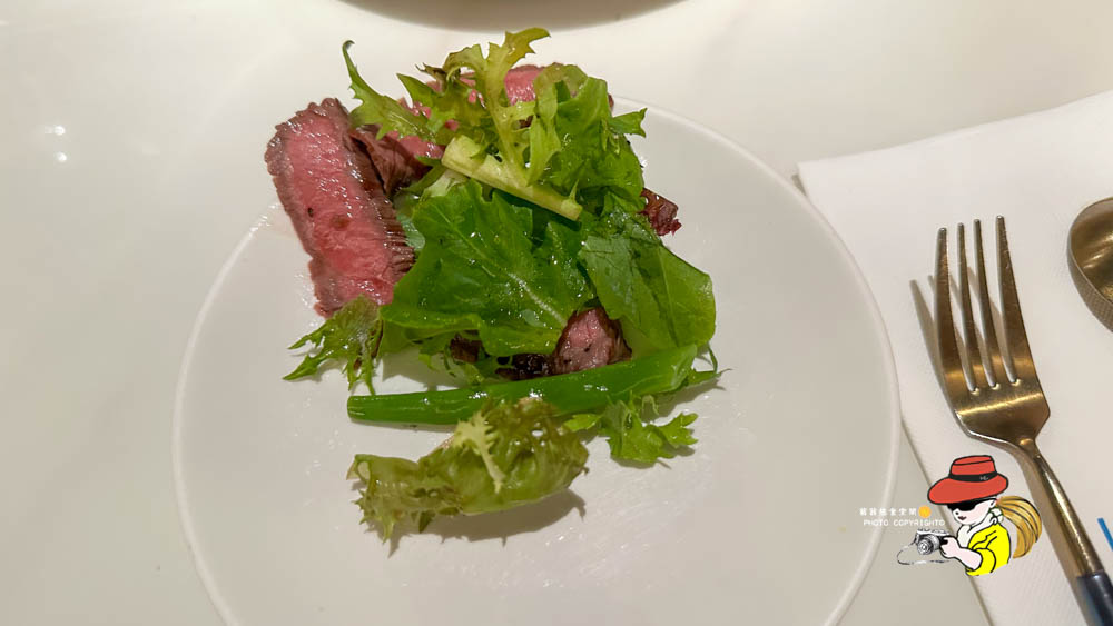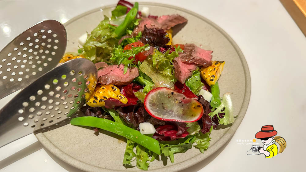 翼板牛排沙拉。這道算是當天比較能接受的餐點了,牛排肉質還不錯,煎得算鮮嫩,搭配沙拉吃起來清爽不油膩。但也就是還不錯而已,沙拉醬汁也沒有特別突出,就是一道很安全的菜色,不會踩雷但也不會留下深刻印象。