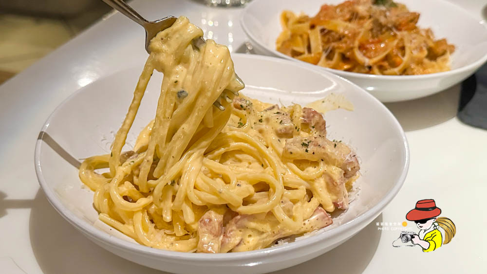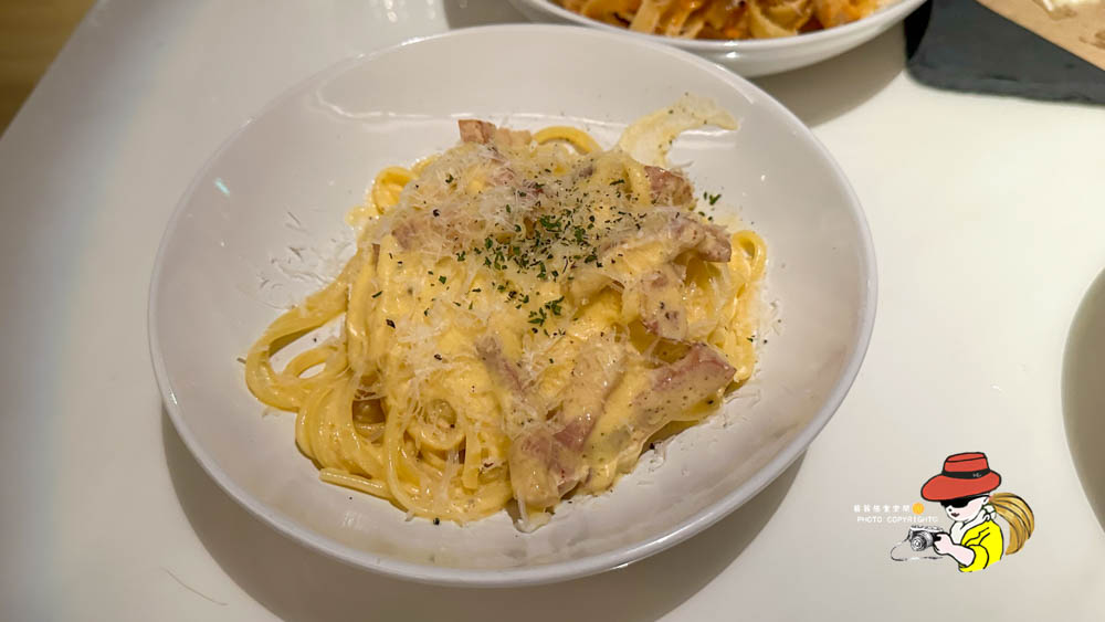 羅馬經典培根蛋奶扁細麵,也就是大家常說的Carbonara。這道基本上就是安全牌,培根、奶油、蛋黃的組合,要弄到難吃也很難,扁細麵口感還OK,醬汁也算濃郁,但就是…免強給過的程度啦!沒有那種讓人一口接一口、會想把醬汁舔乾淨的慾望。