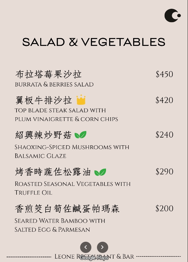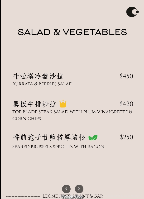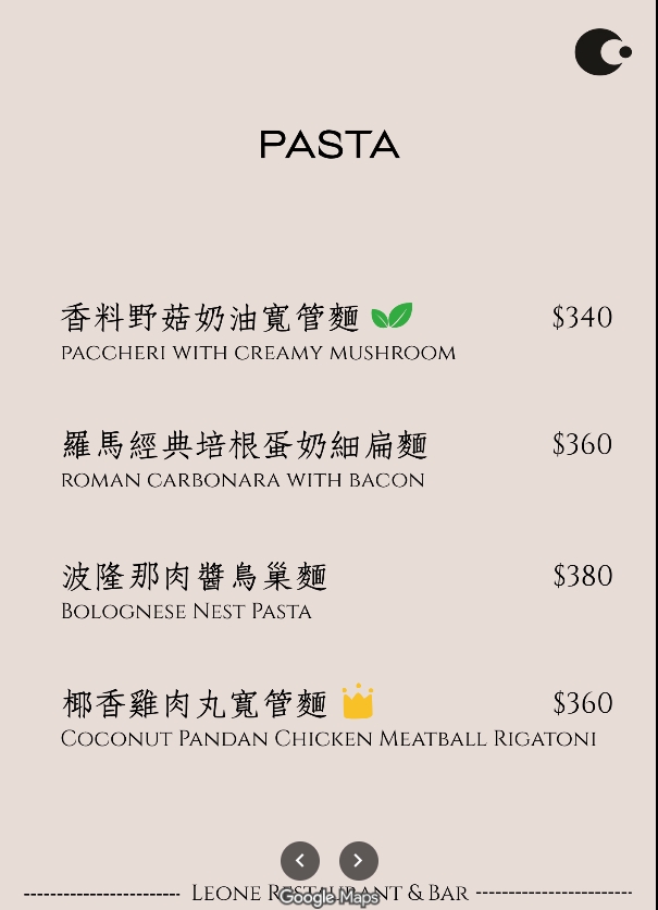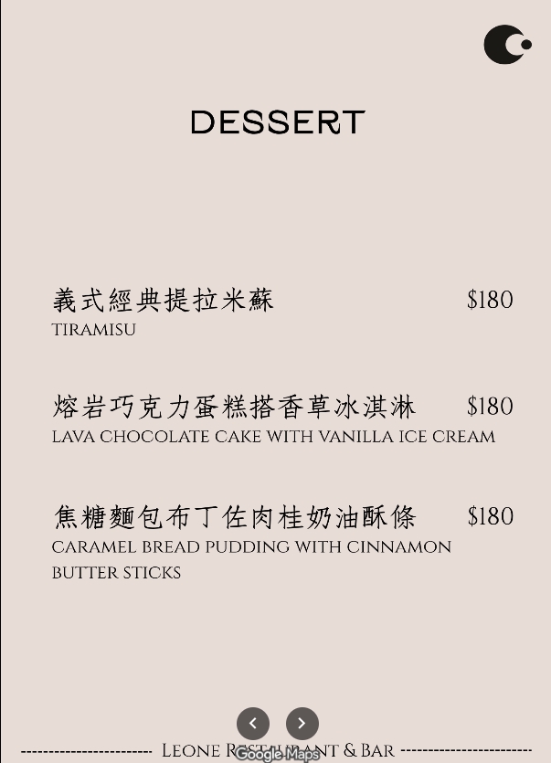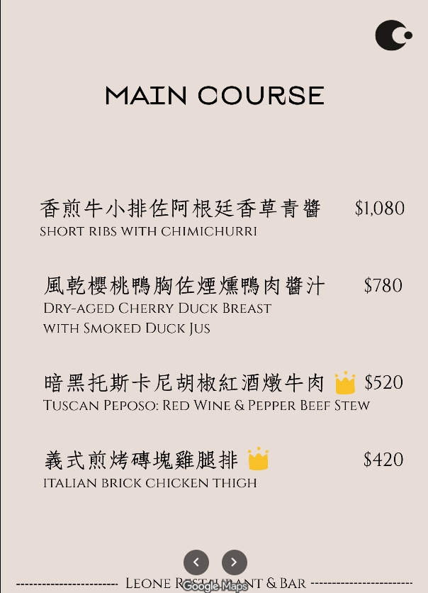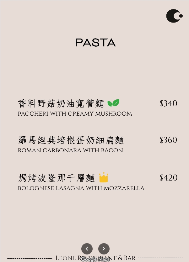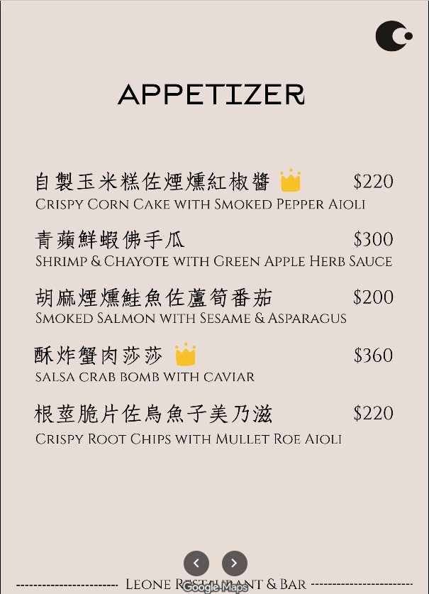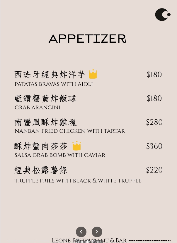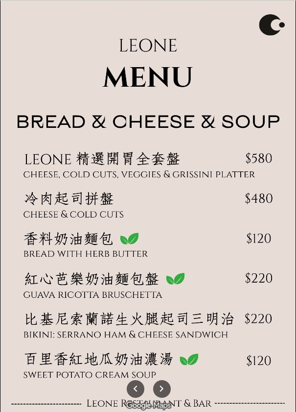 台北中山餐酒館 Leone Restaurant & Bar菜單價目表