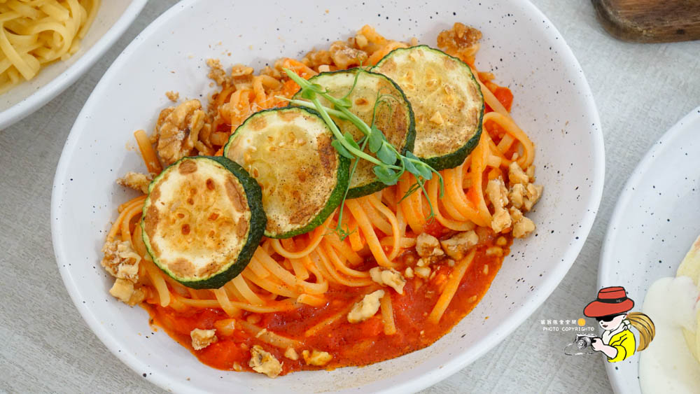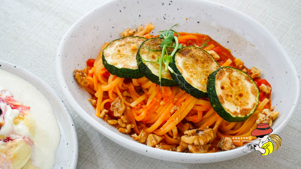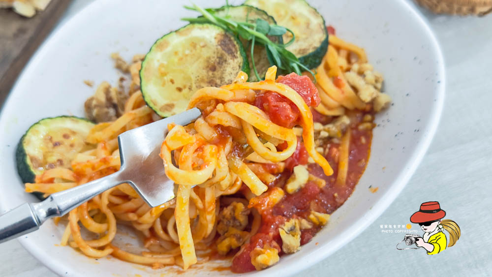 爆愛番茄的你!一定會很愛西西里番茄櫛瓜細扁麵,番茄基底結合櫛瓜脆口滋味,是一盤「吃得到陽光」的義大利麵,濃郁番茄香氣中出酸香的口感就跟老闆與TINA的塔塔醬一樣,帶著特有的檸檬酸香,搭配核桃增添口感層次也非常的適合喜歡輕盈系口味的你。