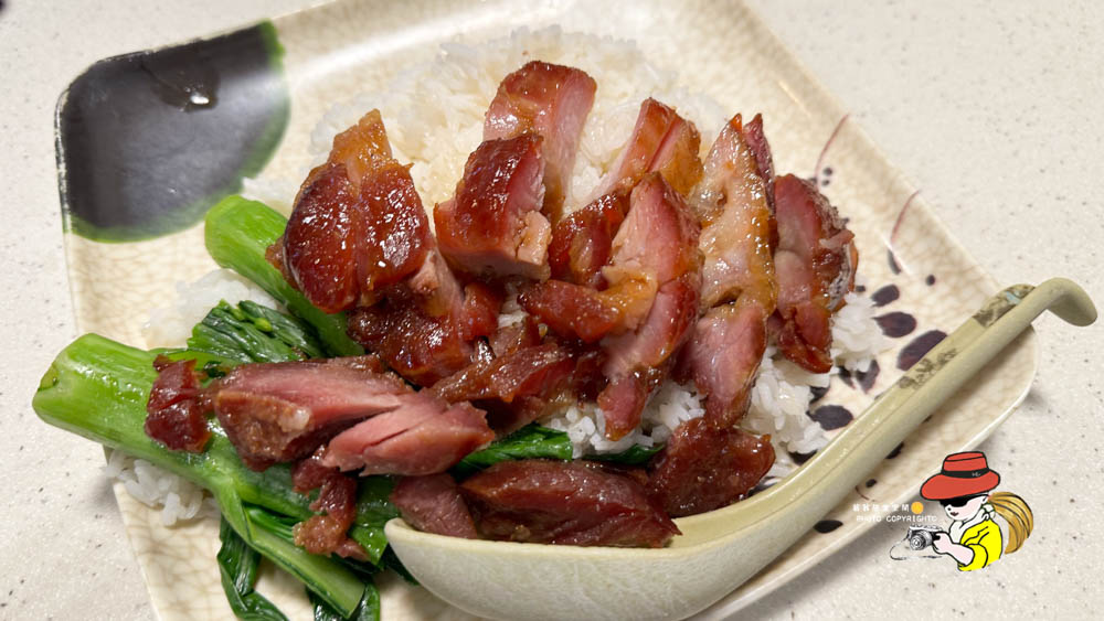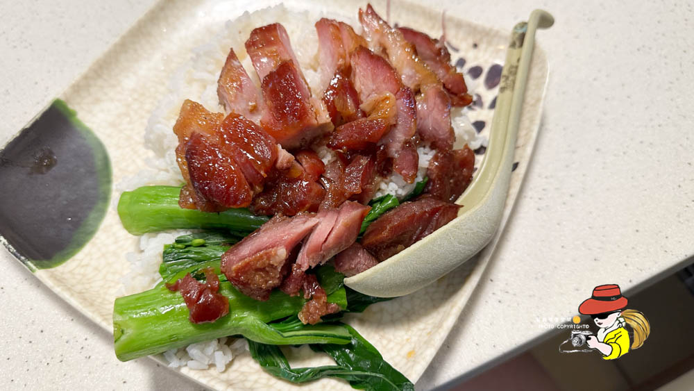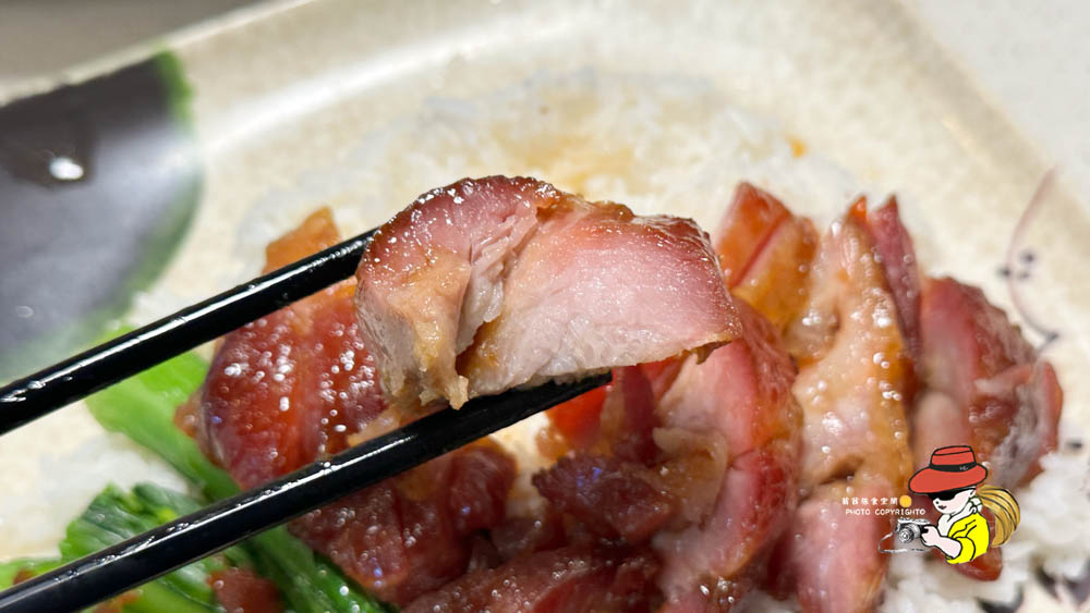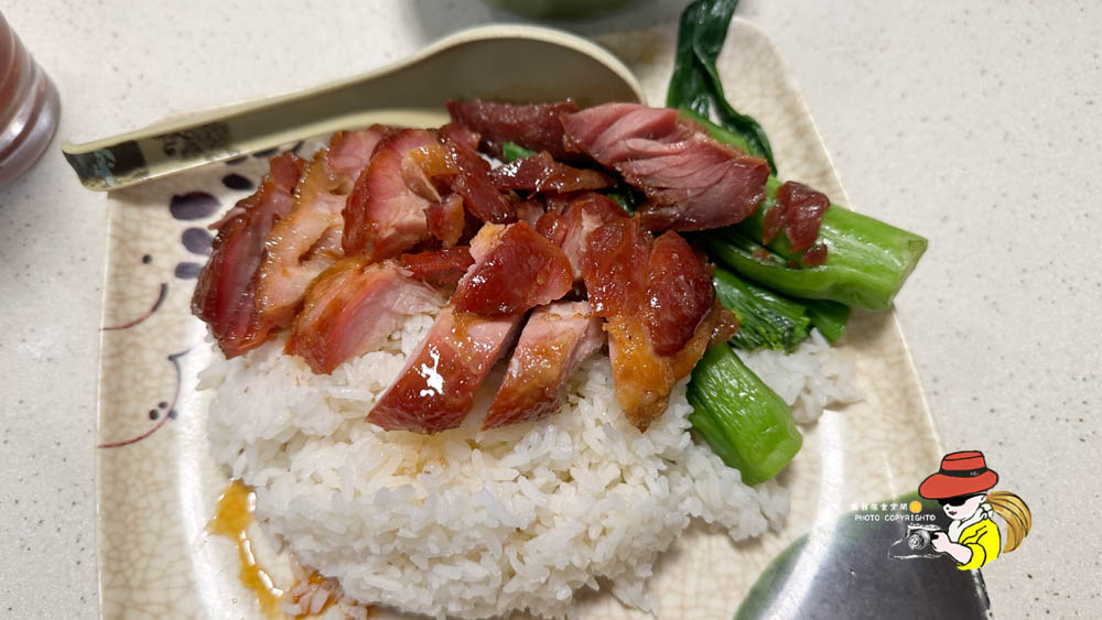尖沙咀森記的蜜汁叉燒飯它的叉燒色澤紅亮誘人,烤得帶點焦香,肥瘦相間,吃起來其實有點柴,哈哈哈哈!但是蜜汁的甜度掌握得剛剛好,不會死甜,反而帶出豬肉本身的鮮味,就是有點柴,美中不足,蜜汁配上粒粒分明的白飯,淋上特製的醬汁,吃起來是真的蠻下飯的~缺點就是兩根菜而已~
