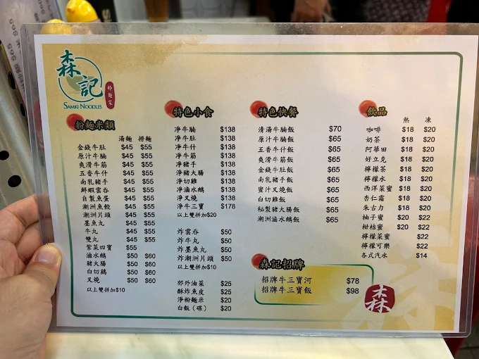 香港尖沙咀森記粉麺家 菜單價目表