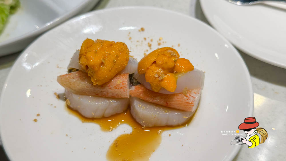 干貝漢堡,這真的是太有創意了啦!兩片肥美的生食級大干貝,中間夾著海膽蟹肉上面擺滿海膽,一口咬下,干貝的鮮甜、海膽的鹹香,在嘴裡完美融合,鮮甜爆漿,直接昇華到另一個境界!這道真的是必點!不點你會後悔!就是很貴而已!