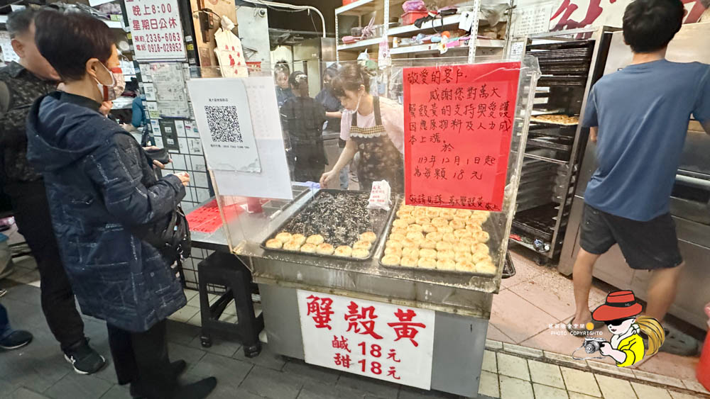 你看看你看看!菜單超簡單粗暴,就是「蟹殼黃燒餅,一律18元!」沒錯,就是這個銅板價!在這個什麼都漲的年代,一顆香酥飽滿的蟹殼黃燒餅才18元,這根本是佛心來著好不好!老闆簡直是把成本都拿去回饋給顧客了,真的超感動的啦~所以啊,每次來我都是直接「鹹的甜的各來五個!」不然你排那麼久的隊,只買一顆也太對不起自己了吧?哈哈哈哈哈!