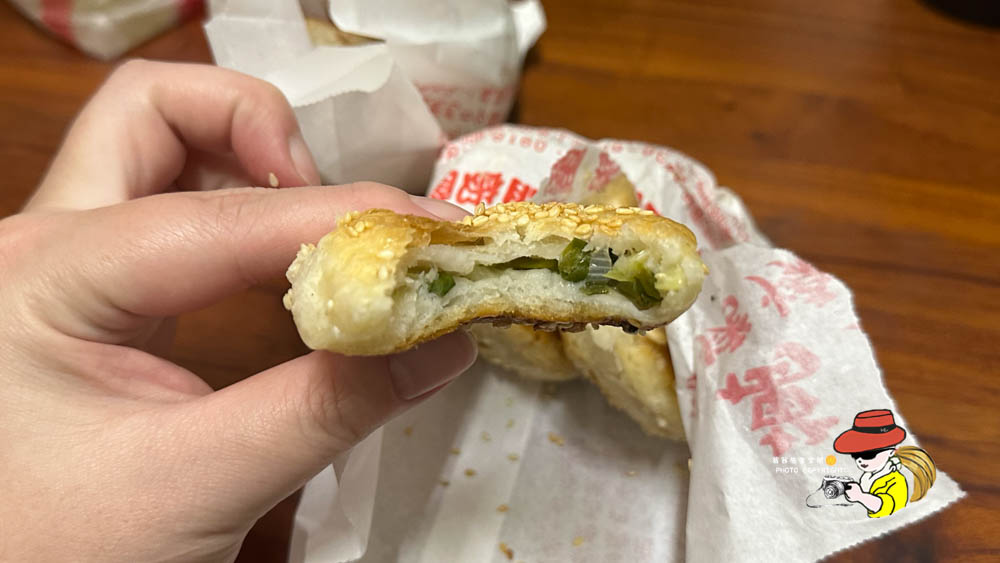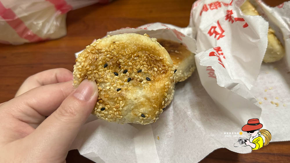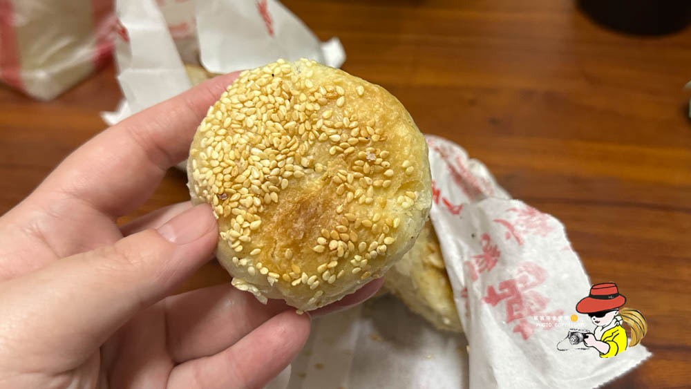 好啦!重頭戲來了!我跟你說,他們家的蟹殼黃燒餅,真的每一顆都像藝術品!尤其是這個鹹口味的,吼~那個外皮烤得金黃酥脆,上面撒滿了白芝麻,光是拿在手上就覺得沉甸甸的,很有份量!一口咬下去,喀滋!一聲,酥到一個不行,然後!重點來了!那個蔥花跟豬油的香氣,直接在口腔裡大爆發!裡面的蔥花給得超大方,每一口都能吃到蔥的清甜跟香氣,搭配上豬油的鹹香,那個味道真的超~濃~郁~的!而且餅皮嚼起來很有彈性,外酥內軟,口感層次超豐富!